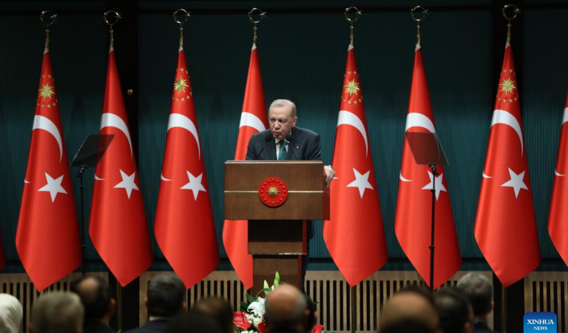 Prezydent Turcji Recep Tayyip Erdogan przemawia do narodu po cotygodniowym posiedzeniu gabinetu w kompleksie prezydenckim w Ankarze w Turcji, 6 kwietnia 2026 r. Erdogan w…